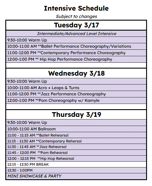 Our Dance Intensives are designed to strengthen technique, expand movement skills, and keep dancers progressing.